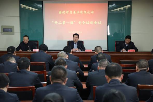 ?xxxx公司黨委副書記、總經理丁合同志傳達了省政府安委會辦公室《關于扎實落實“開工第一課”制度加強企業復工復產期間安全防范的通知》(魯安辦字〔2023〕1號),安全總監劉偉同志主持會議并傳達《泰安市自來水有限公司“開工第一課”實施方案》,安排部署公司全員“開工第一課”培訓活動。